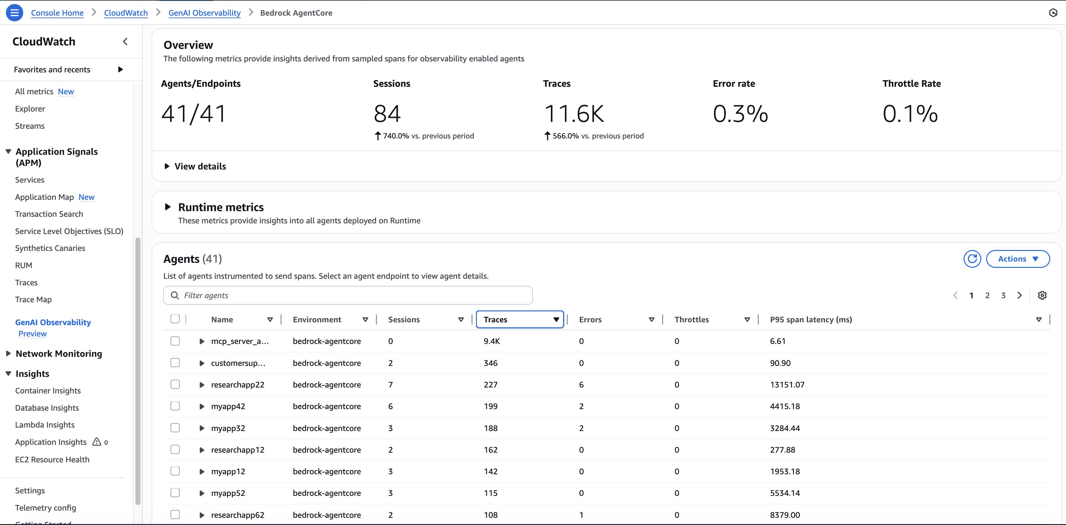 The following screenshot shows the agents in production and their usage (number of Sessions, number of invocations)