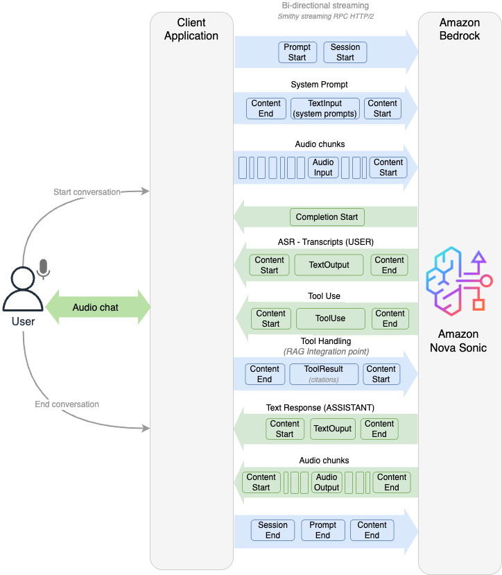 sessionStartevent with model configuration (for example, temperature and topP). - Prompt and Content Start – Client sends structured events indicating whether upcoming data is audio, text, or tool input.