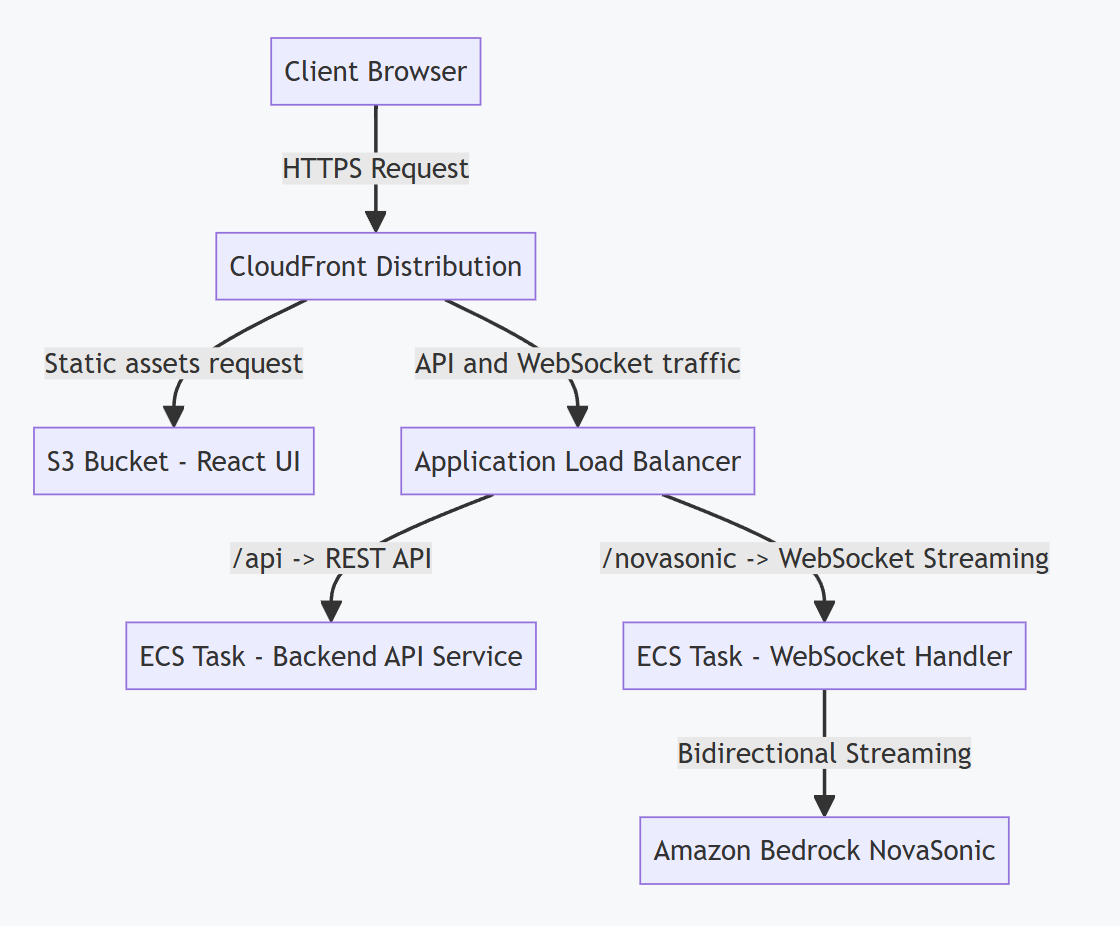 /apiand/novasonictraffic to the Application Load Balancer. - AWS Fargate for Amazon Amazon Elastic Container Service (Amazon ECS) – Runs the backend containerized services for WebSocket handling and REST APIs capable of supporting long lived bidirectional streams.