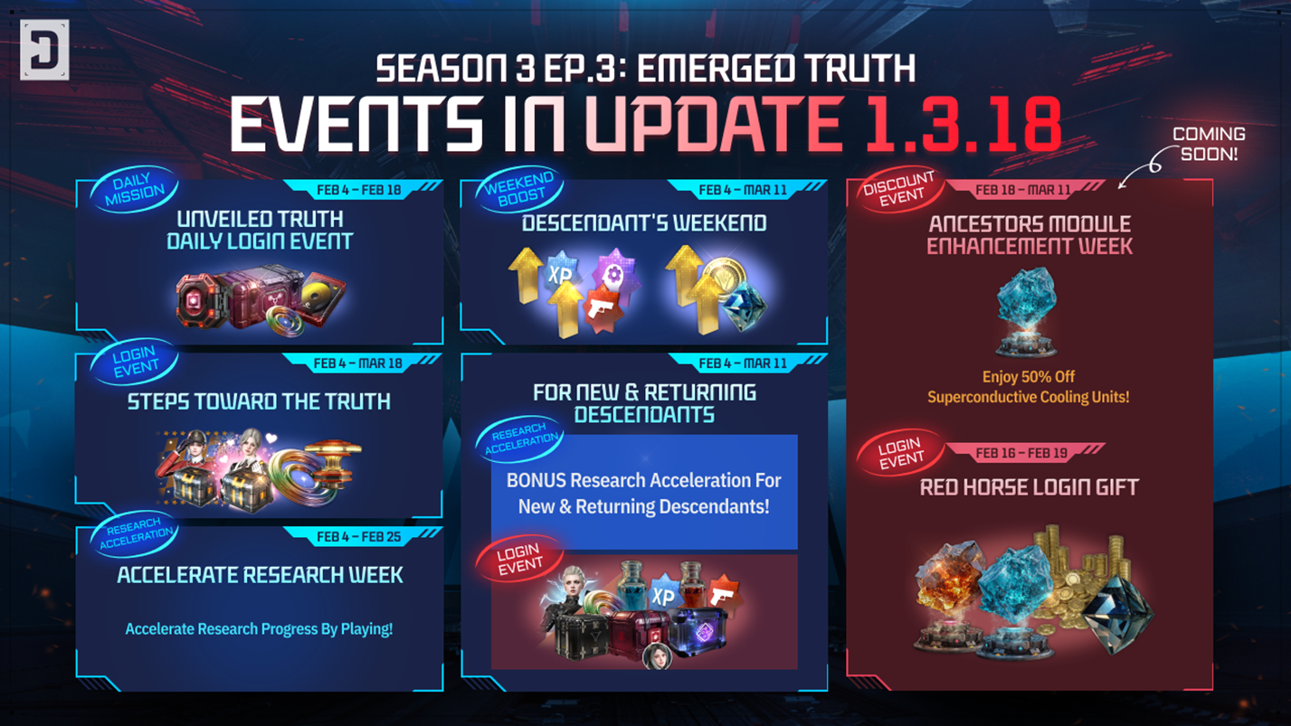 Event NameEvent PeriodUnveiled Truth Daily Login EventAfter the 02.05.2026 (Thu) update - 02.18.2026 (Wed) 22:59 PSTAccelerate Research WeekAfter the 02.05.2026 (Thu) update - 02.25.2026 (Wed) 22:59 PSTDescendant's Weekend02.06.2026 (Fri) 23:00 - 03.08.2026 (Sun) 23:59 PDTSteps Toward the TruthAfter the 02.05.2026 (Thu) update - 03.18.2026 (Wed) 23:59 PDTAncestors Module Enhancement Week02.20.2026 (Fri) 23:00 - 03.08.2026 (Sun) 23:59 PDT※ During the Ancestors Module Enhancement Weekly Event period, the number of Superconductive Cooling Units required for "Ancestors Module Readjustment" is reduced on weekends.※ Detailed information about this event will be provided at a later date.Greetings, Descendants! We would like to inform you of the events that will begin after the 2/5 (Thu) update.Detailed event information can be found after the 2/5 (Thu) update by accessing Game Menu (ESC) > "Events" on the right. ■ Event 1. Unveiled Truth Daily Login EventThis login event celebrates the Season 3 Episode 3 "Unveiled Truth" update.Log in to the game and obtain materials needed for Ancestors Module and Crystallization Catalyst research! - Event Period: After the 02.05.2026 (Thu) update - 02.18.2026 (Wed) 22:59 PST \[Daily Missions]Operation NameReward RequirementsRewardsDaily Login Mission ITotal Play Time 15 min• 1 Ancestors Module Loot II\[Obtain 1 Ancestors Module for any Descendant,[/p]including Dia's Ancestors Module][/td][/tr]Daily Login Mission IITotal Play Time 30 min• 1 Anais's Research Material Box I\[Provides materials needed for Crystallization Catalyst research]Daily Login Mission IIITotal Play Time 60 min• 1 Crystallization Catalyst Blueprint[/table]※ Daily Missions reset at 23:00 PST every day during the event. \[Weekly Missions]Operation NameReward RequirementsRewardsWeekly Login Mission IComplete 4 Daily Login Missions• 2,500,000 Gold• 250,000 Kuiper ShardsWeekly Login Mission IIComplete 8 Daily Login Missions• 5,000,000 Gold• 500,000 Kuiper Shards※ Weekly Missions reset every Thursday at 23:00 PST during the event period. ■ Event 2. Accelerate Research WeekCompleting Accelerate Research content reduces the time of ongoing research.Play the game and complete your research faster! - Event Period: After the 02.05.2026 (Thu) update - 02.25.2026 (Wed) 22:59 PST The Accelerate Research effect stacks with other research boost effects.Accelerate Research content and time reduction can be checked in-game at the Research Institute and World Map via the guide button. ■ Event 3. Descendant's WeekendExperience special boost effects applied every weekend and become even stronger! - Event Period: 02.06.2026 (Fri) 23:00 - 03.08.2026 (Sun) 23:59 PDTEvent Application Period02.06.2026 (Fri) 23:00 - 02.08.2026 (Sun) 22:59 PST02.13.2026 (Fri) 23:00 - 02.15.2026 (Sun) 22:59 PST02.20.2026 (Fri) 23:00 - 02.22.2026 (Sun) 22:59 PST02.27.2026 (Fri) 23:00 - 03.01.2026 (Sun) 22:59 PST03.06.2026 (Fri) 23:00 - 03.08.2026 (Sun) 23:59 PDT ContentApplied BoostComplete Infiltration Operations (Any Difficulty)20% increase to Descendant EXP, Weapon Proficiency, and Arche Tuning EXP gainComplete 1 Sigma Sector or higher (Any Difficulty)Complete 1 Special Operation (Any Difficulty)Gold & Kuiper Shard Gain +20%Breach Tracking※ Boost effects will be applied when playing the above content during the Event Period.※ Can be stacked with effects from other boosts.※ Event boost effects do not apply to Today's Bonus benefits, Amorphous Dimensional Stone rewards, or Special Operation wave interim rewards. ■ Event 4. Steps Toward the TruthClues surrounding Dia are beginning to emerge.Log in daily to uncover the hidden story and receive Attendance Rewards. - Event Period: After the 02.05.2026 (Thu) update - 03.18.2026 (Wed) 23:59 PDTAccumulated LoginsRewardsDay 1• 1 Ultimate Weapon Selection Box III\[Choose 1 from: Thunder Cage, The Last Dagger, Smithereens, Greg's Reversed Fate, Blue Beetle, Restored Relic,[/p]Clairvoyance, Divine Punishment, The Final Masterpiece, Nazeistra's Devotion, Perforator, Executor, Python, Enduring Legacy,Albion Cavalry Gun, Secret Garden, Wave of Light, Afterglow Sword, Piercing Light, King's Guard Lance, Fallen Hope,Peace Maker, Frost Watcher, Hammer and Anvil, A-TAMS, Ancient Knight, ERASER, Shadow,Deus Ex Manus][/td][/tr]Day 2• 1 Energy ActivatorDay 3• 1 Currency Supply Box\[1,000,000 Gold and 100,000 Kuiper Shards]Day 4• 1 Crystallization CatalystDay 5• 100 Precision Ion AcceleratorsDay 6• 50 Dimension AnalyzersDay 7• 1 Ultimate Weapon Selection Box III\[Choose 1 from: Thunder Cage, The Last Dagger, Smithereens, Greg's Reversed Fate, Blue Beetle, Restored Relic,[/p]Clairvoyance, Divine Punishment, The Final Masterpiece, Nazeistra's Devotion, Perforator, Executor, Python, Enduring Legacy,Albion Cavalry Gun, Secret Garden, Wave of Light, Afterglow Sword, Piercing Light, King's Guard Lance, Fallen Hope,Peace Maker, Frost Watcher, Hammer and Anvil, A-TAMS, Ancient Knight, ERASER, Shadow,Deus Ex Manus][/td][/tr]Day 8• 1 C