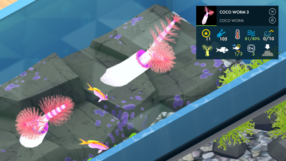 One thing I really like about Coco Worms, is that unlike most corals, they don't need light. This makes them perfect to pair with Mirror Anthias or Reef Squirrelfish, who dislike lights. What's more, if you add at least 3 other species to the tank, the Coco Worms will get a prestige boost thanks to their Communal tag.