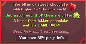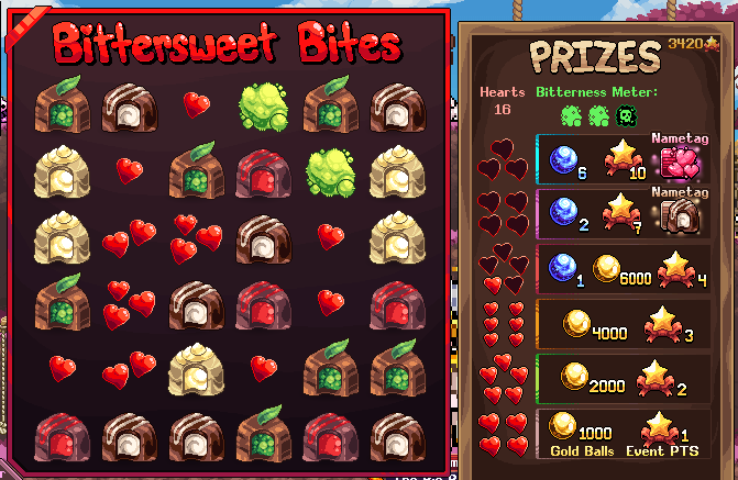 Take bites of sweet chocolate pieces, while avoiding the BITTER ones... only problem is, there's no way to know which is which! Rewards include the Lovely Day nametag, the NEW Choco Nametag, Gold Balls, and of course Event Points!