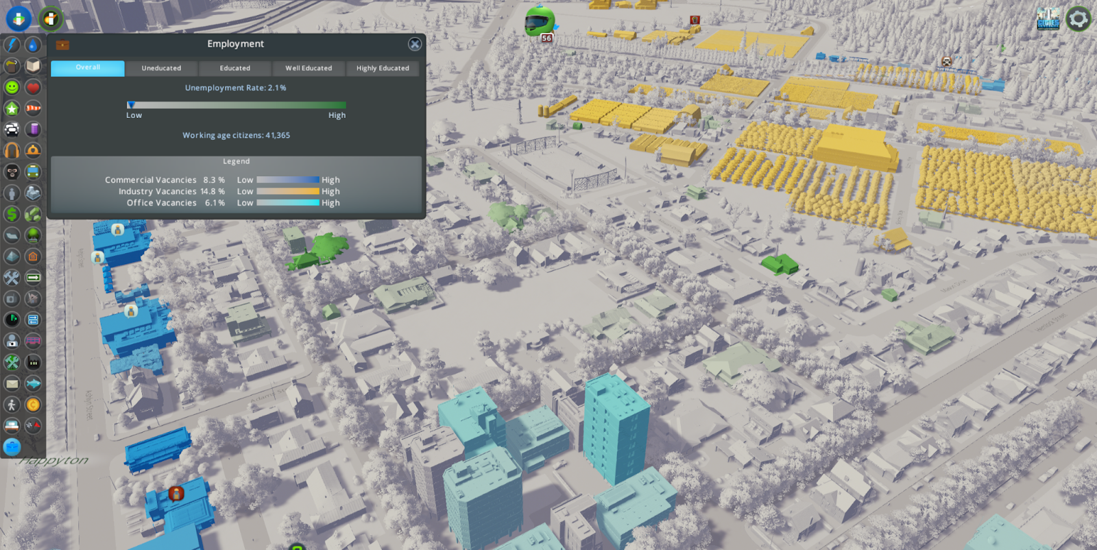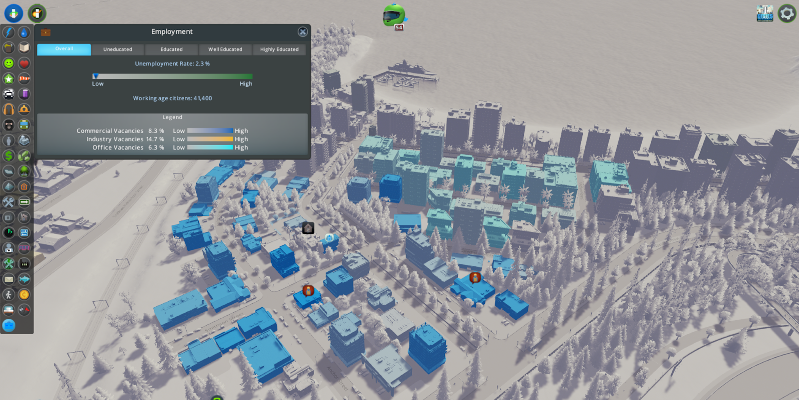 Employment is now visible in the Info Views. Take a look at your city to see if your commercial, industrial, and office zones are in need of workers to fill jobs. You can also check your residential areas to see where unemployed workers live.