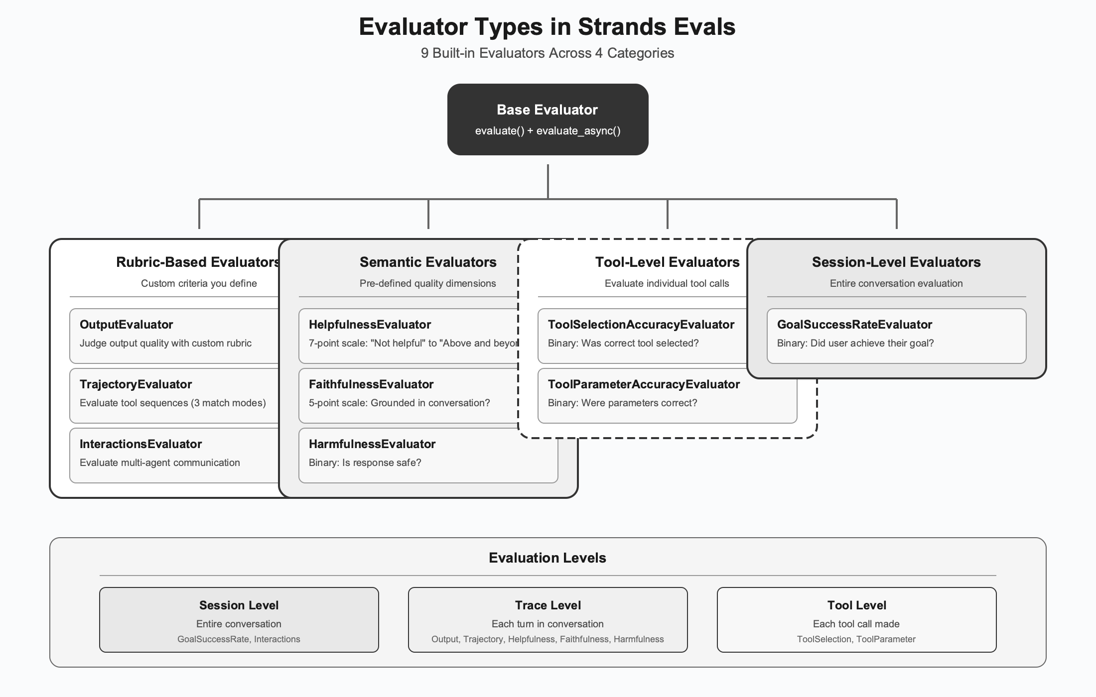 You can use the hierarchical design to compose evaluation suites that check quality at multiple levels simultaneously. Within a single evaluation run, you can verify that individual tool calls are sensible, responses are helpful, and overall goals are achieved.