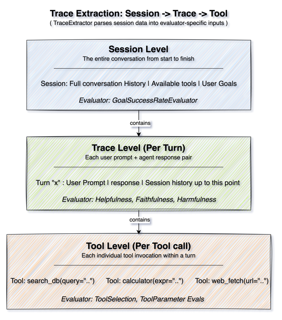 Whether using simulated or real conversations, different evaluators operate at different granularities. Strands Evals uses a TraceExtractor to parse session data into the format that each evaluator needs.