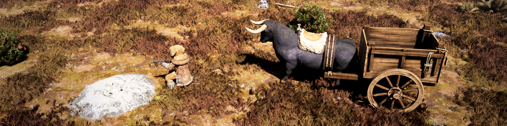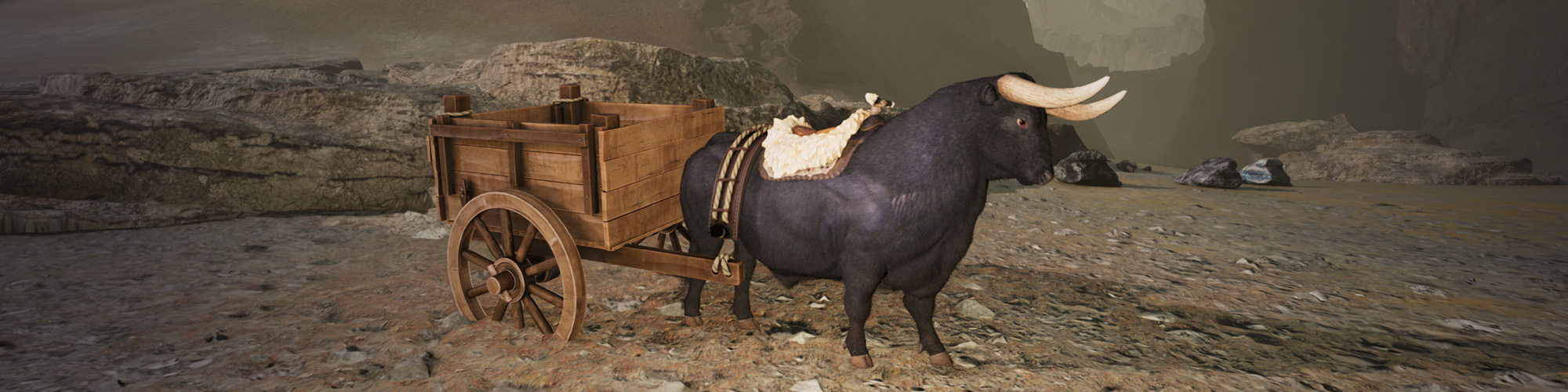 "I recently joined one of our Friday afternoon Icarus Twitch streams, where viewers requested giving the bull the ability to use carts. It was on our to-do list, and luckily the person responsible for doing it (me) was on the stream. Revisiting the cart system for the first time since its implementation gave us a chance to find some improvements. You may notice the saddle bags have been removed when the cart is placed on the bull. Originally, for the buffalo, we decided to add the saddle after the cart had already been made using a workaround that referenced an existing saddle asset.