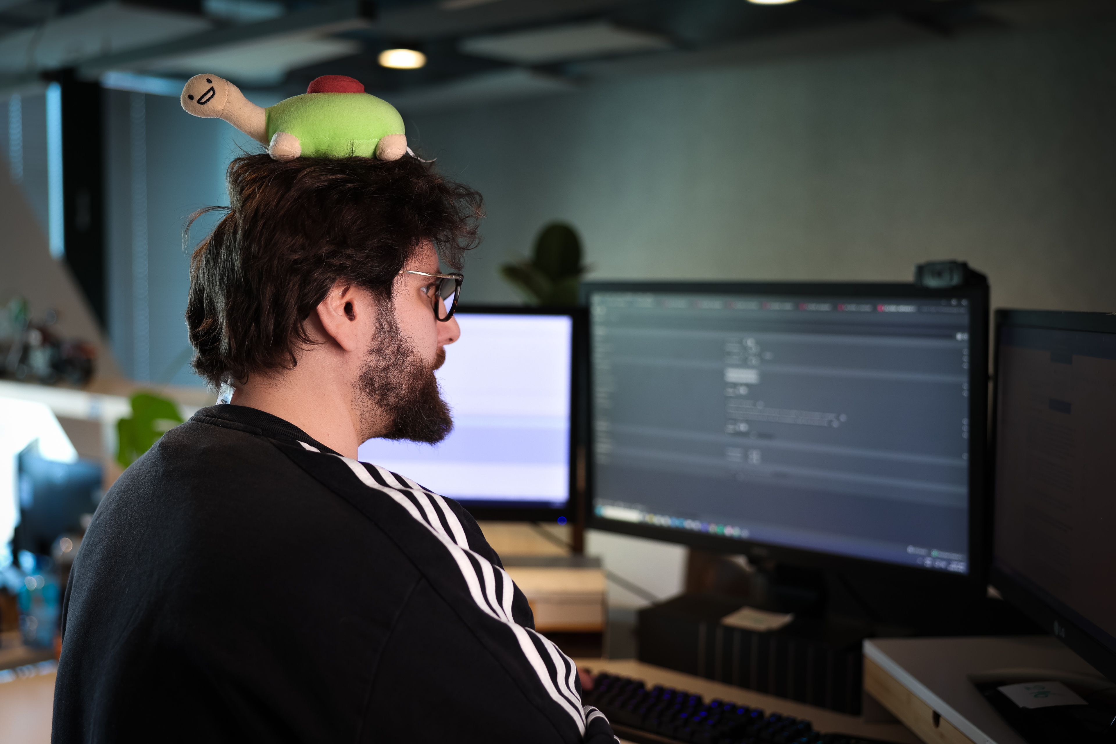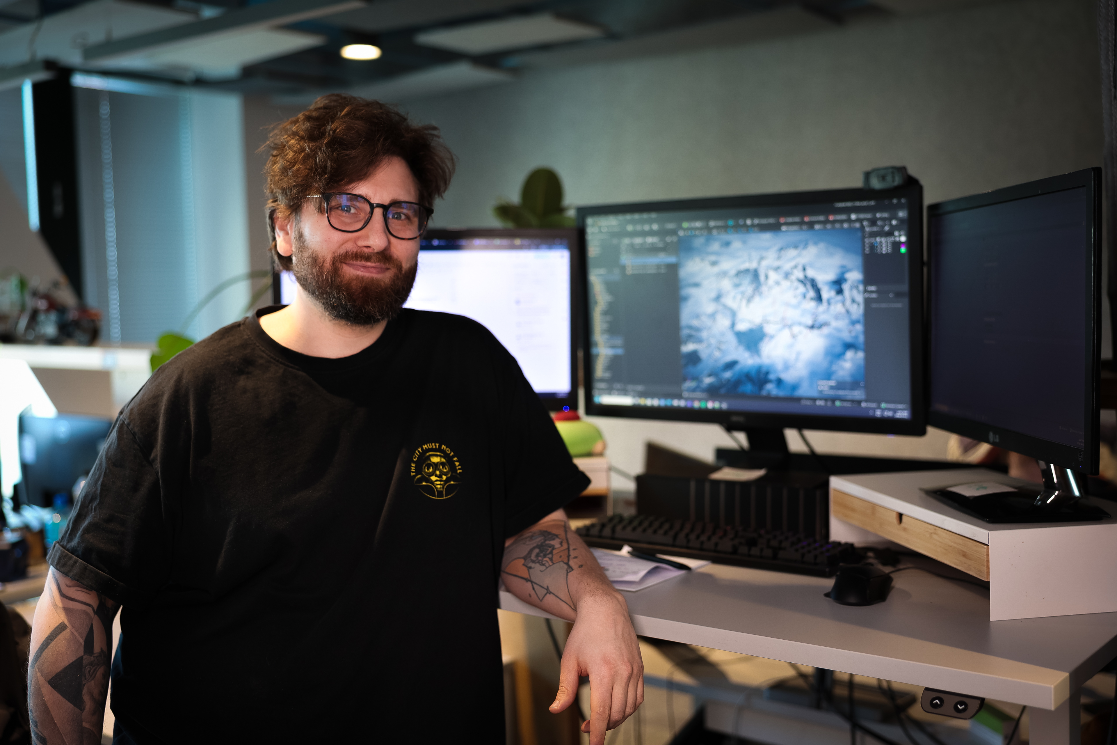 (Paweł's pose from the original Frostpunk dev diaries with the same turtle on his head)