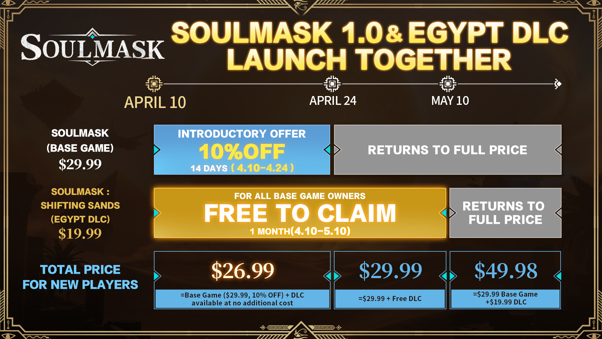 After the launch of 1.0, players who purchase the base game between April 10 and May 10 will also automatically receive the Shifting Sands DLC.