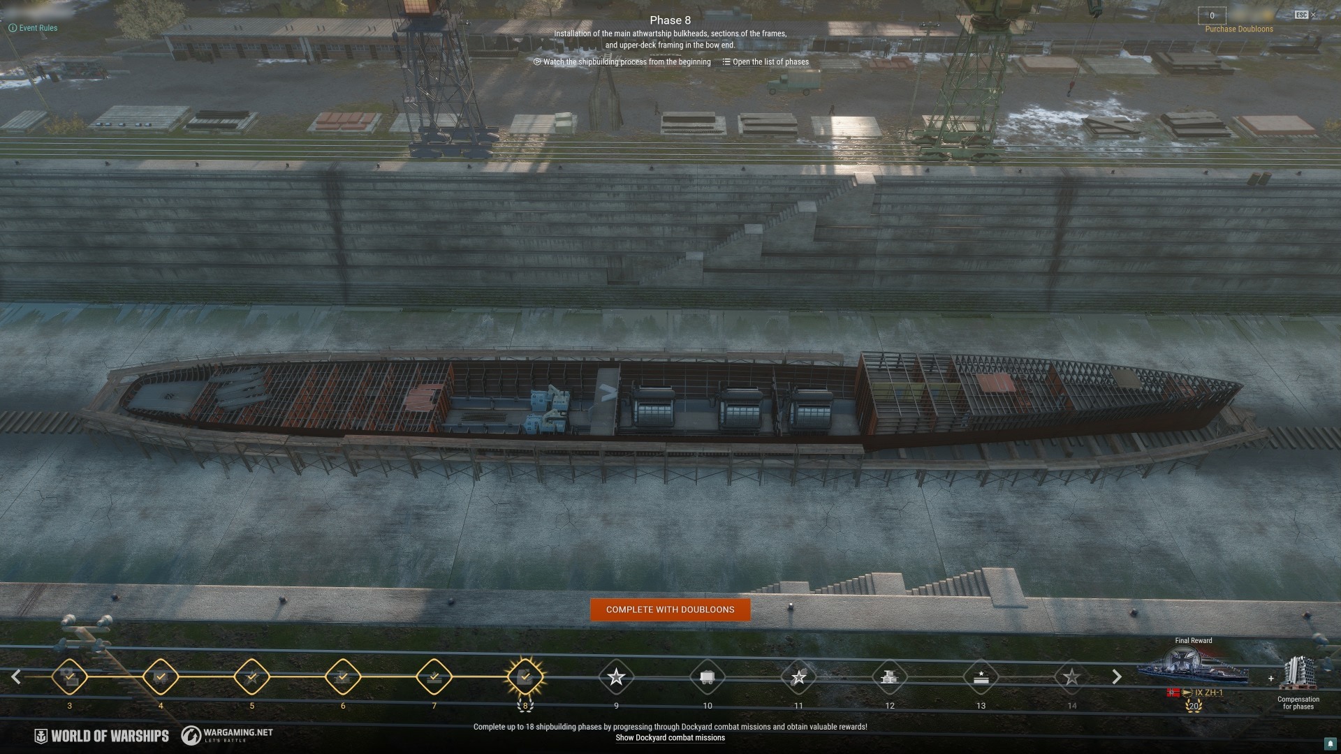 To complete her, you'll need to advance through 20 shipbuilding phases—18 via combat missions and two for Doubloons.