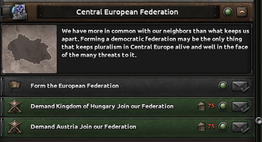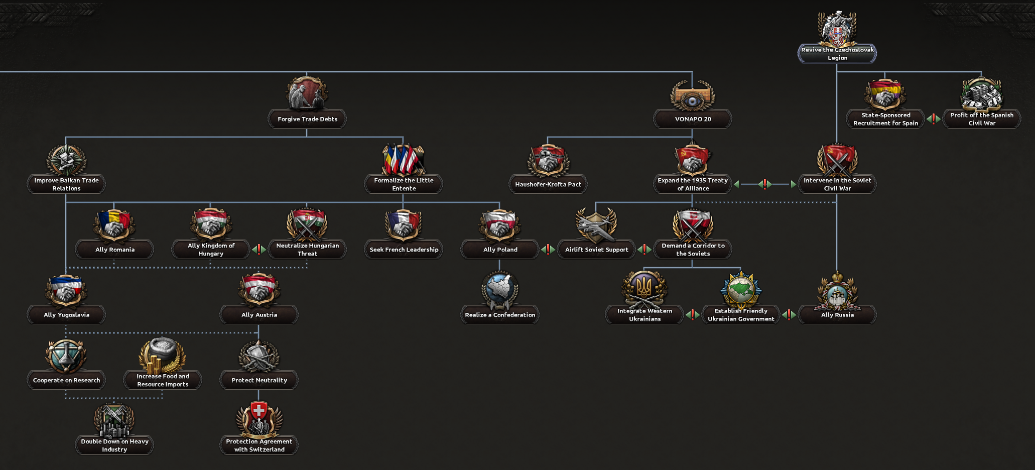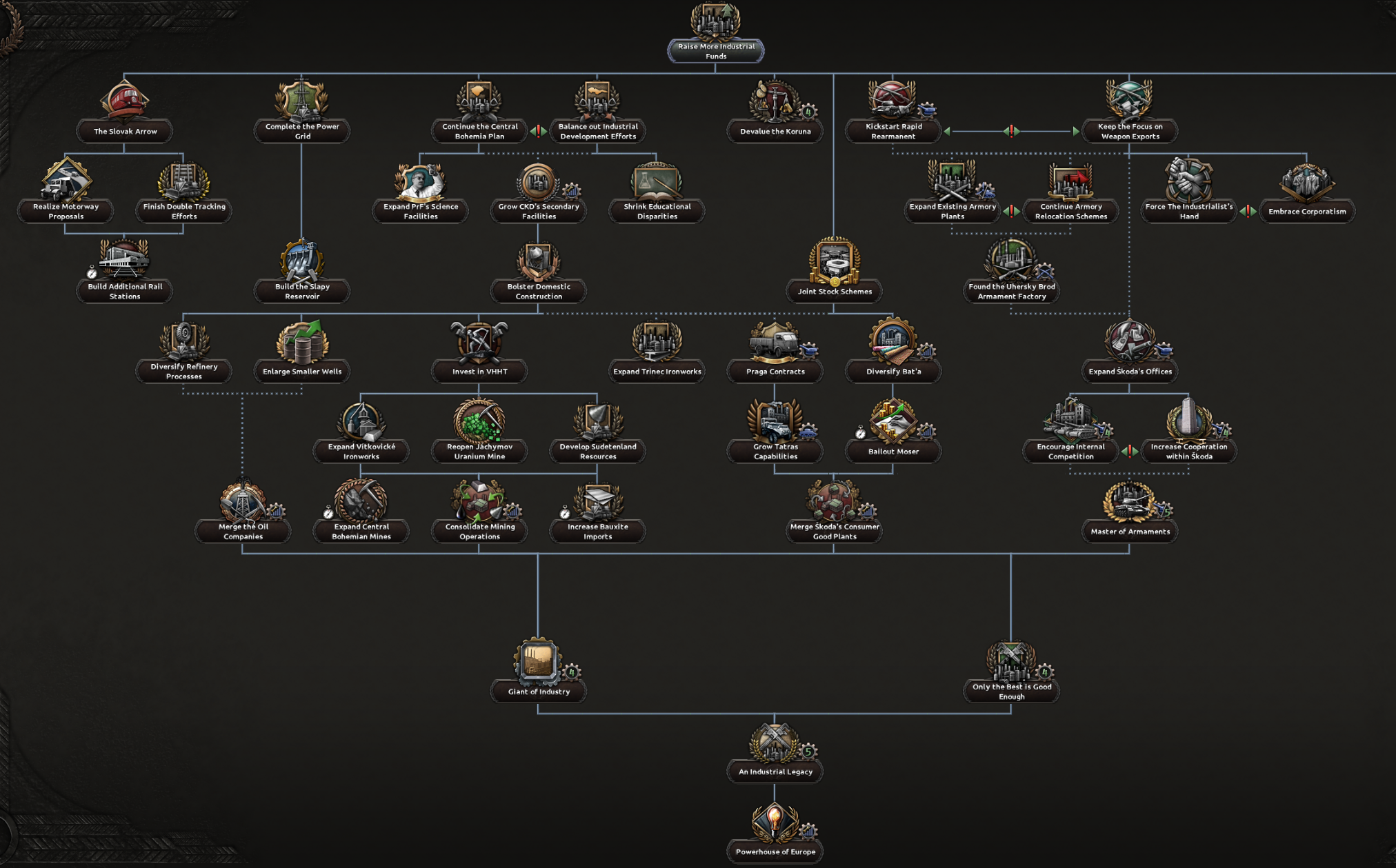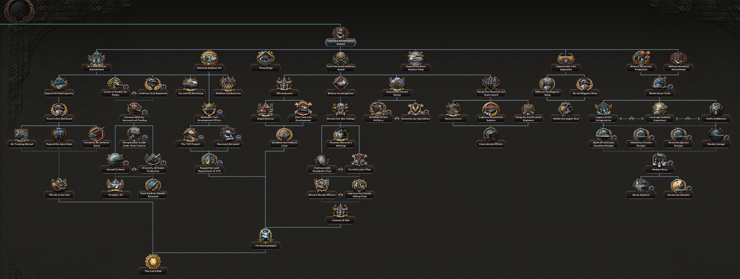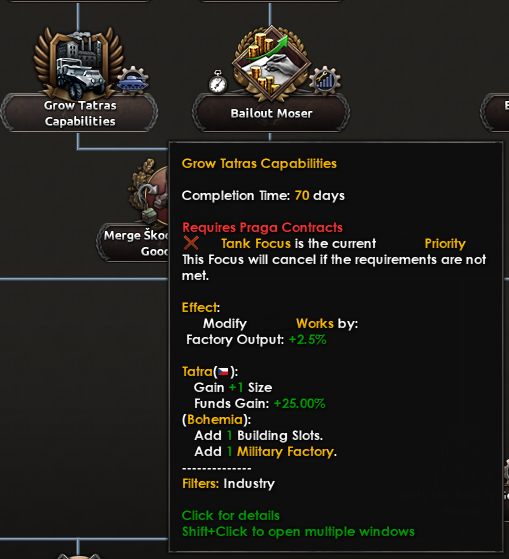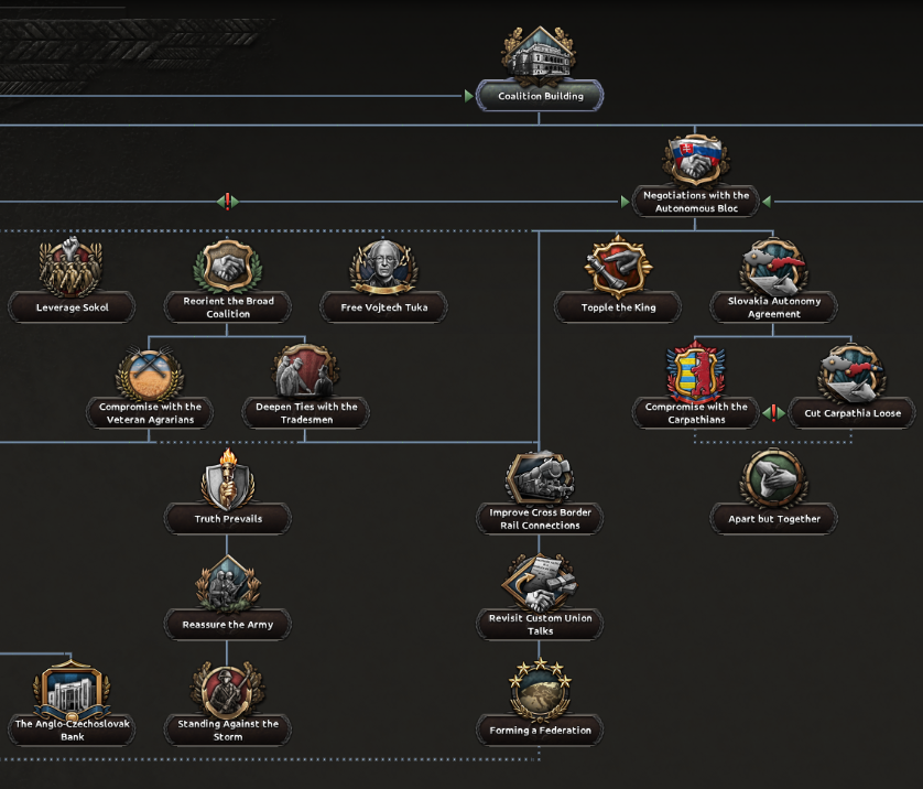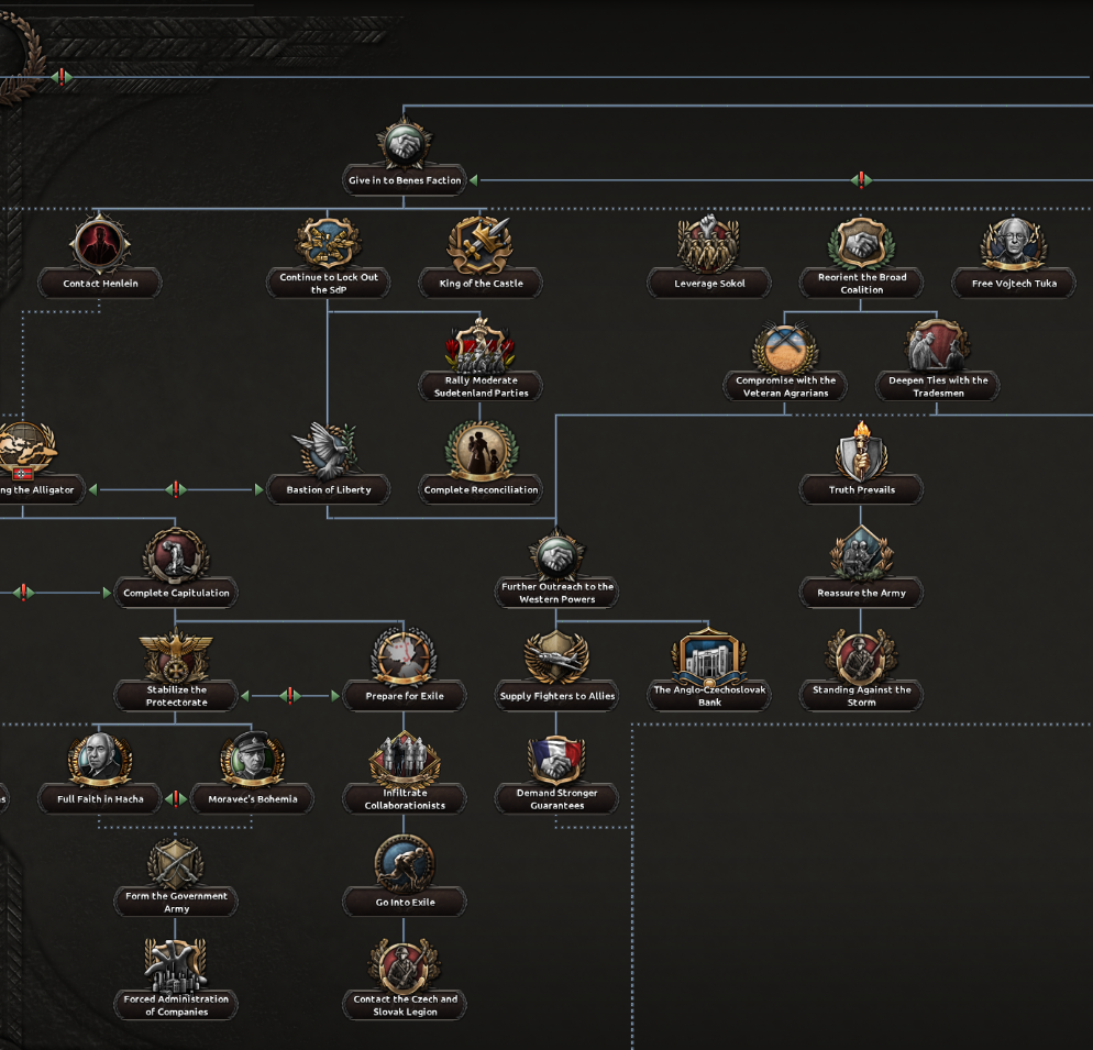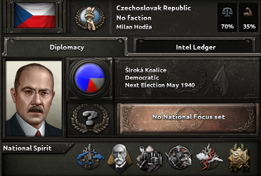 Ahoj! I’m Spicyalfredo, joined by marijn211 and Abbus. We can’t wait to finally show you what we’ve been working on with the “Peace for our Time” focus pack! This DLC will feature a complete rework of everything Czechoslovakia, with a few extras that we will show in this and the following dev diaries. We’ll jump right into the Historical Context that Czechoslovakia finds herself in, before diving into the democratic and shared branches. Historical ContextCzechoslovakia finds itself in an interesting position at the end of the first half of the 1930s. The worst effects of the Great Depression are now behind her, and the country is looking to further its industrial development. The political leadership is under no illusion that their neighbours are potential threats, as they all have designs to redraw the Czechoslovakian borders in their favour. The chief among them is a rearming Germany. Money has already flowed into fortification projects, and ongoing army reforms are underway to address these potential threats. Ongoing diplomatic outreach to the East and West is also underway to reassure Czechoslovakia of its position in the case conflict does arise. Starting leader and National SpiritsHistorical BranchThe Agrarian party has led a broad coalition that has kept Czechoslovakian politics relatively stable through the many crises it has faced. The democratic branch has two paths; one is the historical path, which works with many supporters within the Agrarian party ranks and looks to strengthen the coalition it leads. Greater outreach to the Western Powers is available via this branch as well. So you can at least try to make sure you’re not thrown under any Sudetenland-shaped buses by your ‘Allies’. The government will try to make an outreach to the western powers while stabilizing the broad coalition further.Alt-DemocraticIf instead you decide to make a deal with the devil by allying with the autonomous bloc, Milan Hodža will have more political leverage to explore his ambitious goal of trying to establish a Central European federation, although doing so will come at a high price.The middle parts of the democratic tree are shared between the two branches.Sometimes, more aggressive means are required to preserve democracy in Central EuropeShared DiplomacyTo maximize the number of foreign policy options available to the player, we’ve put a heavy emphasis on shared paths. The left side of the focuses below is accessible for the democratic and communist paths, while the volunteer focuses are always available.It includes new options to gain allies for the Little Entente, as well as new options for stronger cooperation with these allies. The background of the Airlift Soviet Support focus here is noteworthy, as this plan to fly Soviet troops and materiel into Czechoslovakia would have been of unprecedented scale, reminiscent of the Berlin airlift many years later. We’ve represented this operation as a unique air raid, so various factors can influence its outcome.Industry BranchCzechoslovakia contained a lot of the key arms and civilian industry within Austria-Hungary. Investments during the 1930s focused on industrializing the economy further. There are plenty of options to improve the many areas within your industry, be it the civilian or military industry.Plenty of options to build your industrial legacy as CzechoslovakiaThe eagle eye among you might have noticed some focus overlays on some of the focus of this branch. Let’s zoom in on one for a closer look:Tank Icon for Tank Priority Focus, Wrench Icon for Heavy Industry Priority Focus etcTo do some focuses in the Industrial and Army Branches, you must have selected a certain Industrial Priority focus to be able to select the national focus. The overlays relate to the focus’s Industrial Priorities requirements, so you can see them at a glance without having to hover over each focus to glean the requirements. What’s an Industrial Priority, you ask? Well, I’ll have to hand the dev diary over to my partner in crime Marijn, to discuss Industry Priority GUI Mechanic!Industry PrioritySitting between the army and industry branches will be a brand new focus “inlay GUI” which allows you to choose the prioritized sector of your arms industry. Some focuses will require a certain prioritization, while others will affect the modifiers that the prioritization options grant. Choosing a certain sector as a priority for a longer period of time will scale its benefits (and small maluses) linearly by the optimization tier, which increases over time.The Weapons Industry Prioritization mechanic, the default option at the top, is selected, granting slight bonuses to civilian productionThis new mechanic represents the scale and modernity of the Czechoslovak arms industry, which can also be observed in the focus of the industrial branch as mentioned above.Military BranchThe Czech Army was in the middle of reforms and modernization to meet the threats that they saw on the horizon. Despi