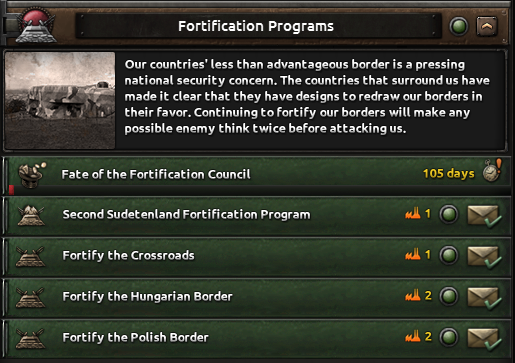 The fortification programs have been transformed from focuses into decisions. Allowing Czechoslovakia to walk and chew gum. These decisions will use civilian factories while they run to represent the massive economic investment that these fort programs took.