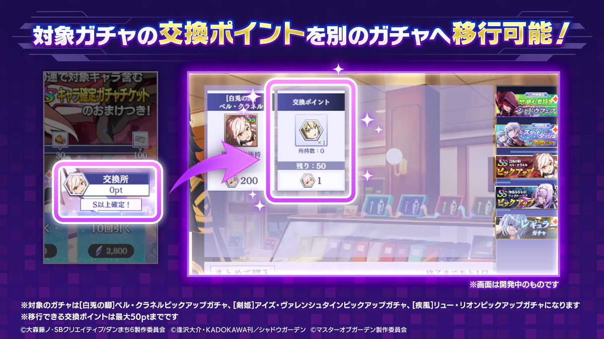 対象ガチャの交換ポイントを、最大50ptまで別の対象ガチャの交換ポイントと交換することが可能になりました!