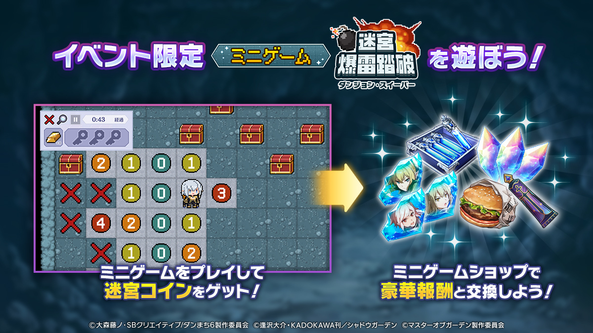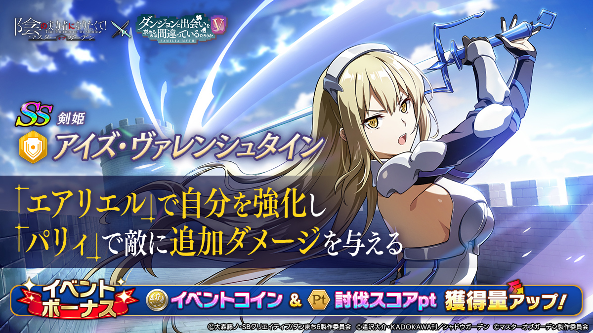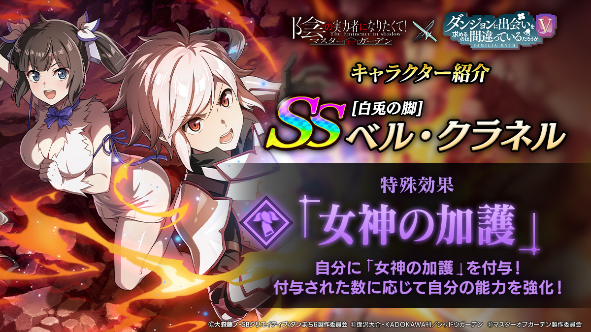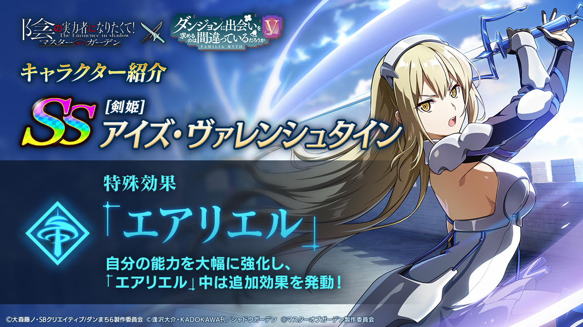 『ダンまちV』コラボ開幕!コラボイベント「ダンジョンに陰の実力者が現れるのは間違っているだろうか」開催!イベントクエストを進めると、限定のストーリーをお楽しみいただけます!新キャラクター登場!4/16(木)13:00より[白兎の脚]ベル・クラネル がピックアップされたガチャが開催中!「女神の加護」を得て強力な奥義を発動するアタッカーです!新キャラクターのご紹介「[白兎の脚]ベル・クラネル」が登場!■特殊効果「女神の加護」自分に「女神の加護」を付与し、その数に応じて自分の能力を強化交流について[白兎の脚]ベル・クラネルを獲得すると、ヘスティアとの交流が解放されます。豊富なトークをお楽しみください!新キャラクター登場!4/16(木)13:00より[剣姫]アイズ・ヴァレンシュタイン がピックアップされたガチャが開催中!「エアリエル」で自分を強化し、「パリィ」で敵に追加ダメージを与えるタンクです!新キャラクターのご紹介「[剣姫]アイズ・ヴァレンシュタイン」が登場!■特殊効果「エアリエル」自分の能力を大幅に強化し、「エアリエル」中は追加効果を発動交換ポイント移行可能!対象ガチャの交換ポイントを、最大50ptまで別の対象ガチャの交換ポイントと交換することが可能になりました!交換ポイントを移行する際は、対象ガチャの交換所をご確認ください。▼対象ガチャ・[白兎の脚]ベル・クラネル ピックアップガチャ・[剣姫]アイズ・ヴァレンシュタイン ピックアップガチャ・[疾風]リュー・リオン ピックアップガチャ ※4/23(木)13:00~追加予定おすすめパーティ編成『ダンまちV』コラボキャラクターのおすすめパーティ編成をご紹介!ぜひ参考にしてみてください!※[疾風]リュー・リオンは4/23(木)から登場予定です。ミニゲーム開催!ミニゲーム「迷宮爆雷踏破(ダンジョン・スイーパー)」を開催中です!爆弾の位置を予想して、鍵を集めながらゴールを目指しましょう!さらに、ミッションクリアでもらえる「迷宮コイン」は豪華アイテムと交換が可能です。ミニゲームでたくさん遊んで豪華報酬を獲得しましょう!復刻シャドウフェスガチャ開催!4/16(木)より復刻シャドウフェスを開催!シャドウフェス限定キャラ [陰の双始者]シャドウ&アルファ がピックアップ!2回限定!4/16(木)より、有償幻魔石×2,800個で引くことができる「黄属性スペシャル選抜SS確定ガチャ」を開催中!本ガチャでは10キャラ目に選抜されたSSキャラが必ず出現します。さらに、キャラ獲得時に専用魔道具の魔力液も同時に獲得できます!この機会をお見逃しなく!※詳細はゲーム内お知らせをご確認ください。