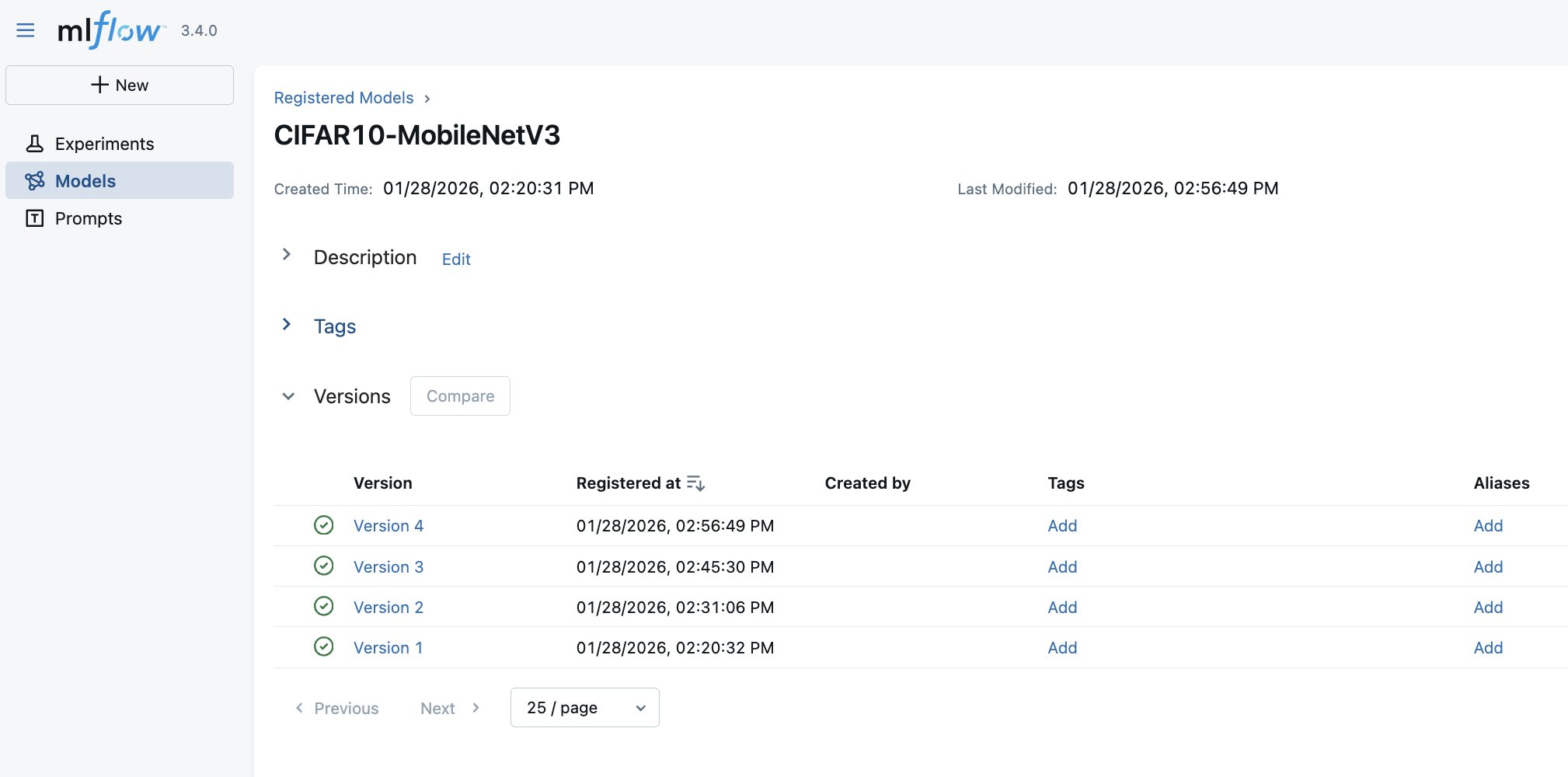 - Experiment comparison – MLflow provides side-by-side comparison of models trained on different data versions, with full parameter and metric tracking.